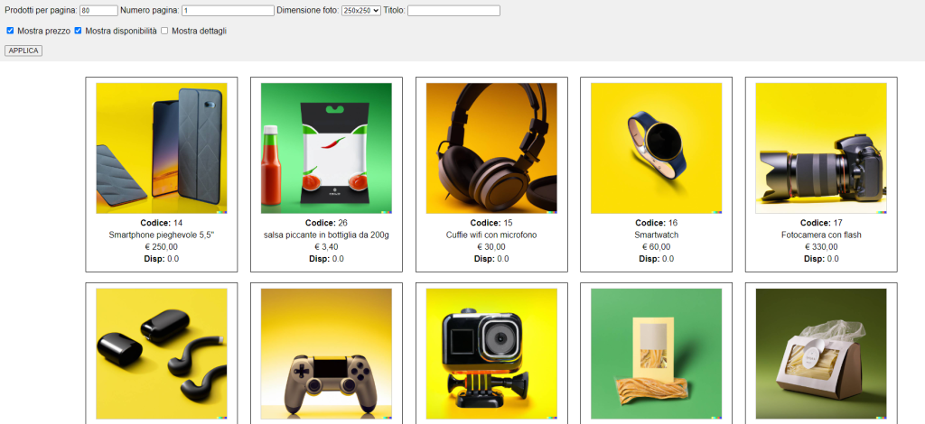 Si aprirà una pagina in cui è possibile configurare dimensione foto, visualizzazione o meno di prezzo, disponibilità o dettagli e il numero di articoli per pagina (max 400).
