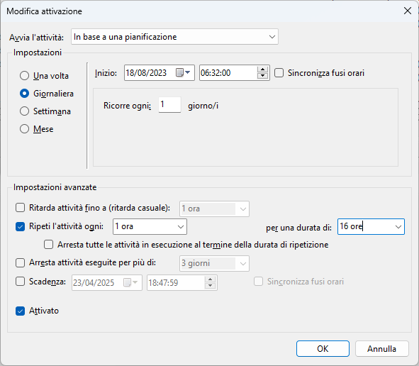 Seleziona “Giornaliera” mettendo “ripeti attività ogni…” su un intervallo minimo di 1 ora, per eseguire un’esportazione più volte nella giornata. È consigliato selezionare un orario di inizio compreso fra le 6 e le 7 e di scegliere un minuto che non sia 00, in modo che le richieste di varie aziende non avvengano tutte allo stesso minuto.